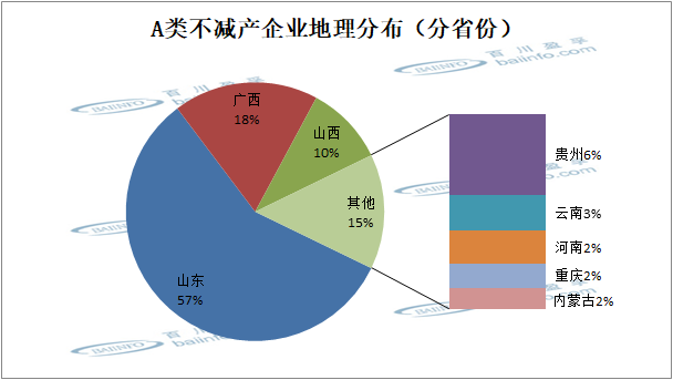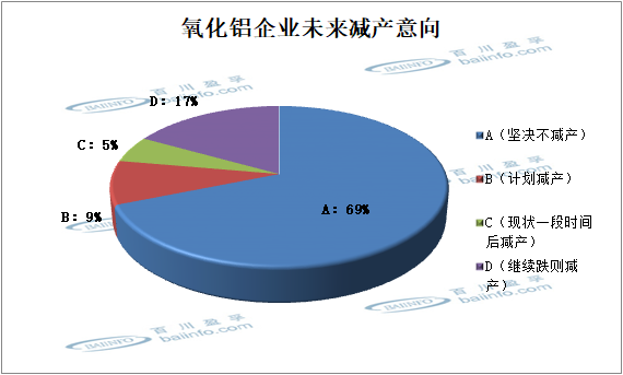 1、百川盈孚对于近期氧化铝企业心态进行调研,截至4月17日,中国氧化铝建成产能为8614万吨,开工产能为6560万吨,百川将开工产能按照A(坚决不减产)、B(计划减产)、C(现状维持一段时间后减产)、D(继续跌则减产)分为四类,具体分布如下: