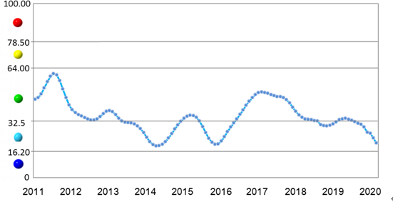 2020年3月份,中国铝冶炼产业景气指数为19.9,环比回落2.8点;先行合成指数为47.5,环比回落2.0点。近13个月中国铝冶炼产业景气指数见表1。模型监测结果显示,3月份产业景气指数已降至“偏冷”区间下部,与此同时先行合成指数仍延续下行态势。由此可见,全球新冠肺炎疫情对中国经济及铝冶炼产业的负面影响已在显现,而且影响的深度及持续时间依然面临较大不确定性,产业景气度低迷状态短期内或将持续。 表1 近13个月中国铝冶炼产业景气指数 2020年3月份,中国铝冶炼产业景气指数环比回落2.8点,降至19.9,已处于“偏冷”区间下部。中国铝冶炼产业月度景气指数走势见图1。