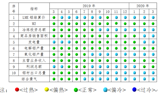 由中国铝冶炼产业景气信号灯(见表2)可见,2020年3月份,在构成产业景气指数的10个指标中,LME铝结算价、铝冶炼投资总额、商品房销售面积、发电量、氧化铝产量和铝材出口总量等6个指标继续处于“偏冷”区间;M2、电解铝产量、主营业务收入和利润总额等4个指标位于“正常”区间。
