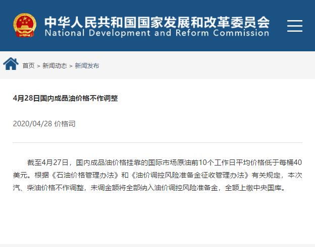 截至4月27日,国内成品油价格挂靠的国际市场原油前10个工作日平均价格低于每桶40美元。根据《石油价格管理办法》和《油价调控风险准备金征收管理办法》有关规定,本次汽、柴油价格不作调整,未调金额将全部纳入油价调控风险准备金,全额上缴中央国库。