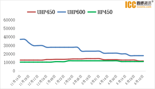 图:2019.11-2020.06中国石墨电极主要型号价格走势图(单位:元/吨)