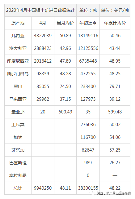 2020年4月中国进口铝土矿月度均价下跌0.75美元至48.11美元/吨,市场主流国别矿石价格稳中微跌。