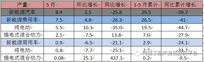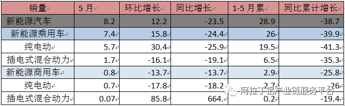 5月,新能源汽车产销分别完成8.4万辆和8.2万辆,同比分别下降25.8%和23.5%。1-5月,新能源汽车产销分别完成29.5万辆和28.9万辆,同比分别下降39.7%和38.7%。