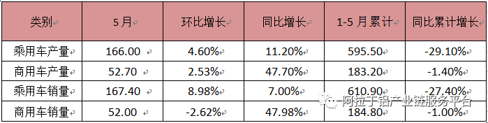 5月,乘用车产销分别完成166.0万辆和167.4万辆,环比分别增长4.5%和8.9%,同比分别增长11.2%和7.0%,增速已由负转正。1-5月,乘用车产销分别完成595.5万辆和610.9万辆,同比分别下降29.1%和27.4%。