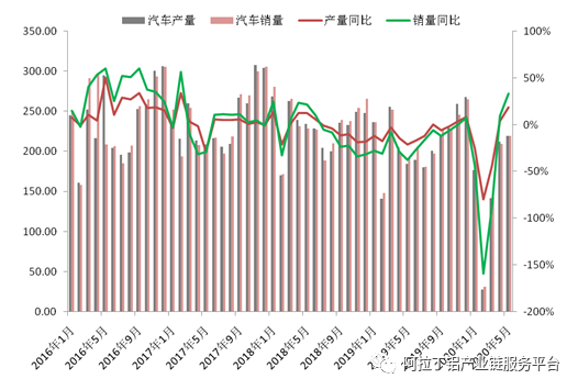 中国汽车工业协会数据显示,我国5月份汽车产销分别完成218.7万辆和219.4万辆,环比增长4%和5.9%,同比分别增长18.2%和14.5%,1-5月汽车产销分别完成778.7万辆和795.7万辆,产销量同比分别下降24.1%和22.6%。阿拉丁(ALD)统计结果显示,当月中国汽车全行业用铝26.12万吨,其中乘用车用铝22.29万吨,商用车用铝3.83万吨,1-5月用铝93.17万吨,其中乘用车用铝79.88万吨,商用车用铝13.29万吨。
