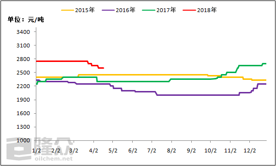 近期磷酸二铵由于春季市场启动不理想,处于高价位的二铵实际新单跟进量偏少,走货困难,企业报价较前期下调趋势,现湖北地区二铵主流出厂报价2600-2650元/吨;基层市场售价混乱,悲观预期较重,近期营口港64%黄色二铵低端港口自提价在2700元/吨左右,褐色二铵也仅在2750-2780元/吨,黑龙江绥化市场64%二铵出库价跌至2800-2850元/吨,市场低价丛生。