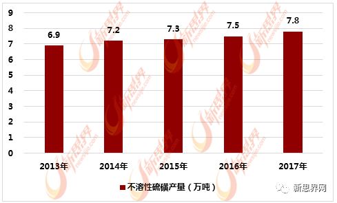 根据新思界发布的《2018-2022年中国不溶性硫磺行业发展现状及投资可行性研究报告》显示,2013-2017年,中国不溶性硫磺产量总体上呈现缓慢上升的趋势,其中2013年的产量为6.9万吨,到2017年增长至7.8万吨。