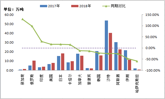 图3.2018年1-2月硫磺进口量按来源地数量同比图