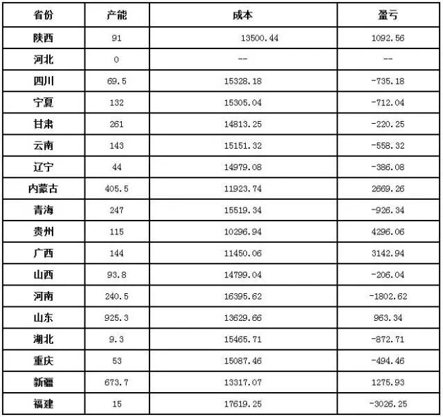 2018年4月份全国电解铝企业亏损比例继续上升。据卓创统计,4月份电解铝产能成本在12000元/吨以下的产能规模为0;12000-13000元/吨产能规模168万吨,占比4.27%;13000-14000元/吨产能规模为1471.2万吨,占比41.68%;产能成本大于14000元/吨的产能规模1890.9万吨,占比53.57%。 全国产能加权成本按省份统计