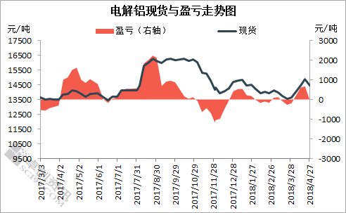 卓创监测数据显示,截至4月底,我国电解铝企业算数平均生产成本14437.72元/吨,较上月底上升611.6元/吨,行业平均盈利2.28元/吨;加权平均生产成本13823.43元/吨,较上月底上升301.39元/吨。4月份涉及利润统计的电解铝运行产能3530.1万吨,亏损产能1252.1万吨,亏损产能占比34.19%,较上月下降0.62个百分点。