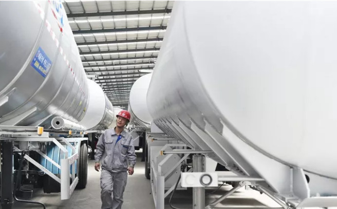 工人从三星明航轻量化罐体成品间穿过