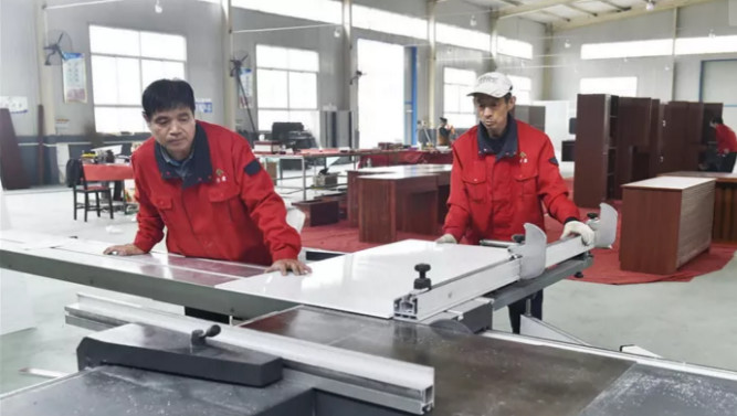 山东方霖铝业科技有限公司工人在切割型材