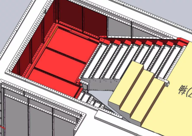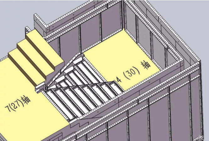 另外这个楼梯是有休息平台的,这个部位有的是项目要求,有的是设计和生产习惯,考虑加盖板或者不加盖板,黄色的填充是混凝土。