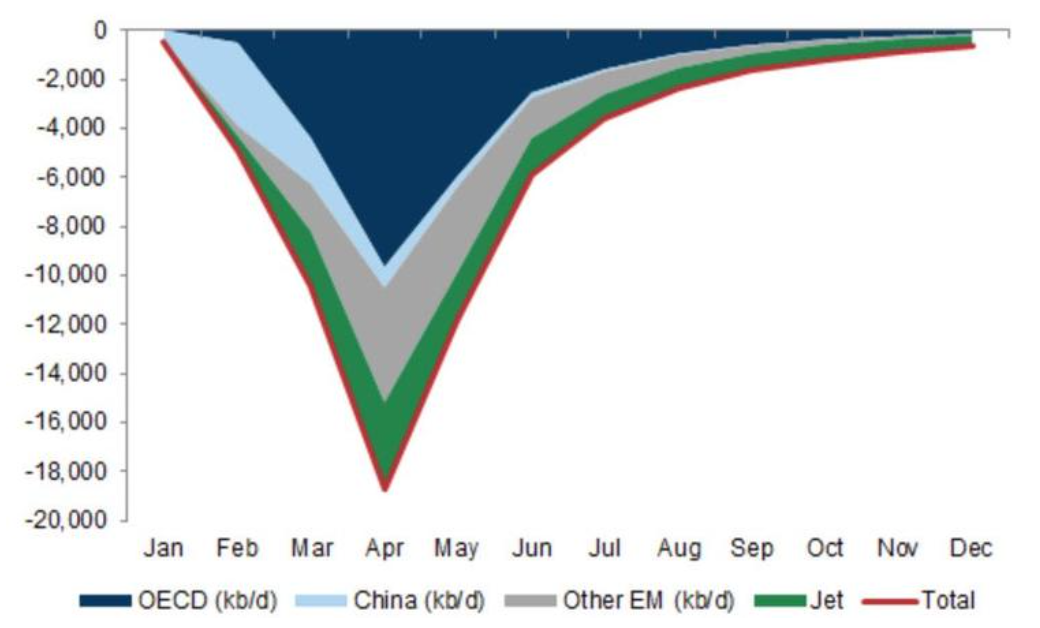 但实际上,沙特的“表演”仅仅只是表象。油价目前真正的症结在于因为新冠导致的需求崩溃。