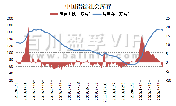 铝锭价格的下跌伴随着铝锭库存再次上升,2019年12月铝锭社会库存已由前期168.16万吨下降至64.65万吨,2020年1月开始铝锭社会库存一路上行再次飙升至168.36万吨。2020年4月6日铝锭社会库存出现小幅度回落,市场再次发出铝价是否已探底回升的声音。